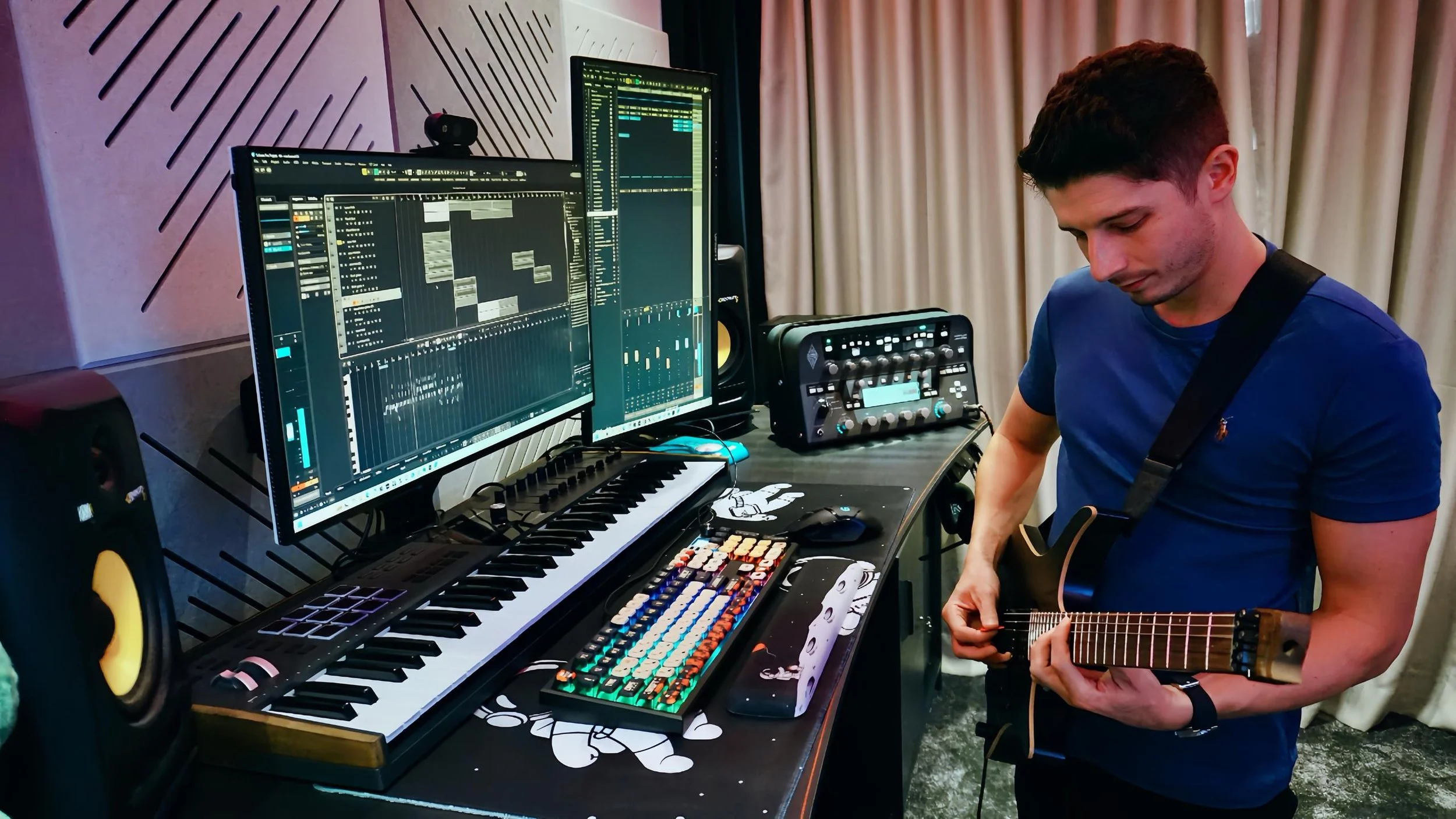 A man in a blue shirt playing an electric guitar in a music studio. The studio has dual computer monitors displaying audio editing software, a MIDI keyboard, studio speakers, and various audio equipment on a desk.