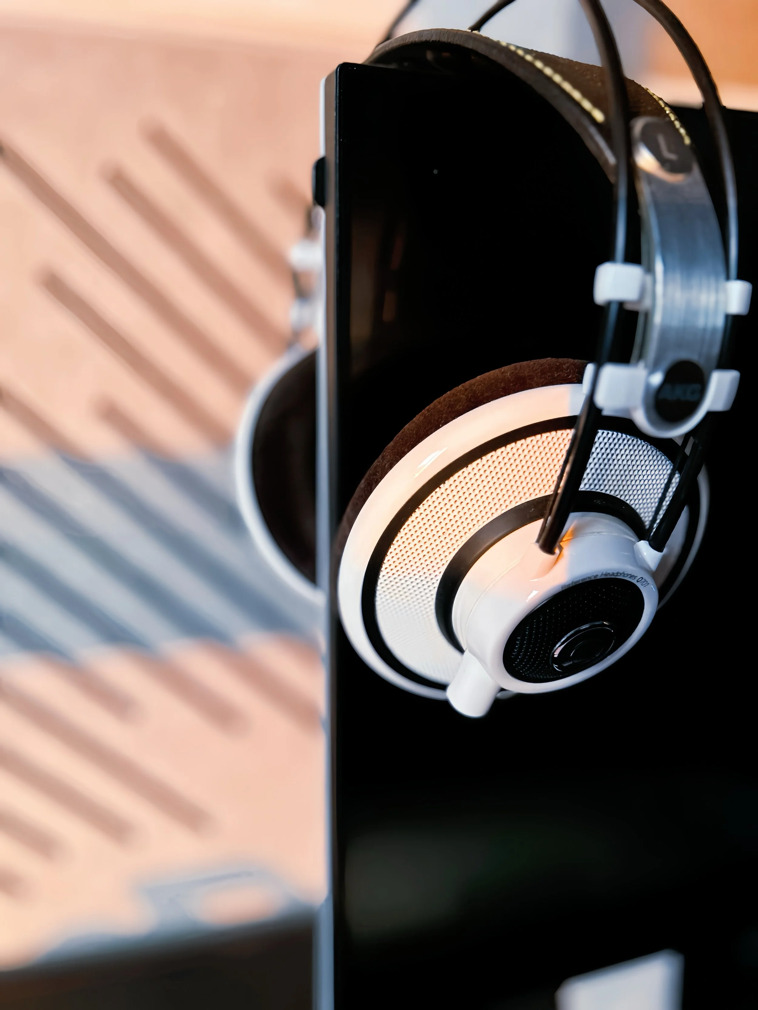 Over-ear headphones hanging on a smartphone set on a stand with blinds in the background.